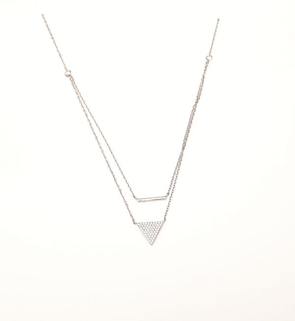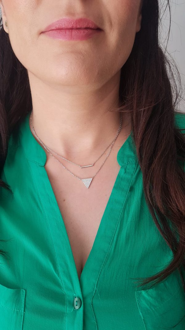 Este es un colgante de moda donde tienes dos collares en uno. Lleva una barra de plata junto con un triángulo de circonitas.
