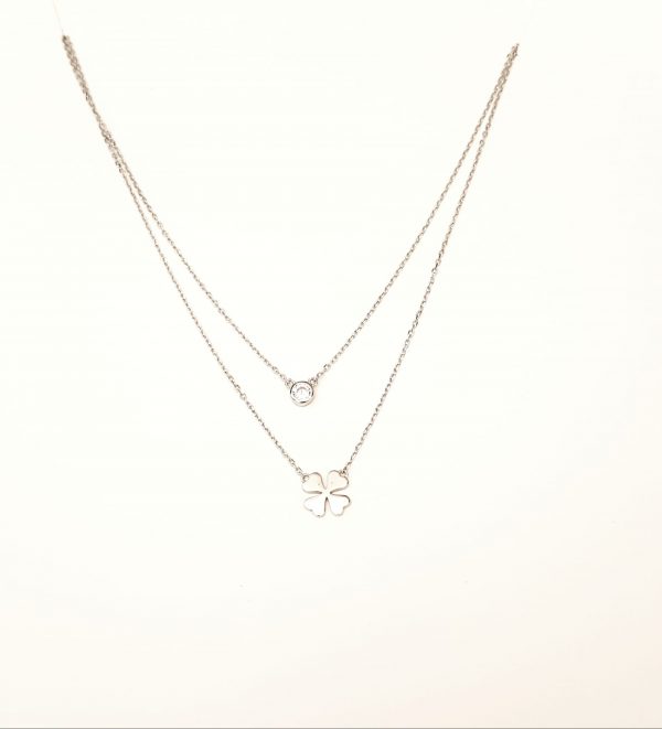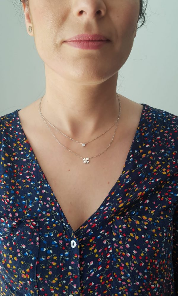 Con este colgante llevarás dos piezas en el mismo collar. Una circonita de 4 milímetros y un trébol de cuatro hojas que te dará suerte. Será un regalo o auto regalo muy especial.
