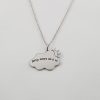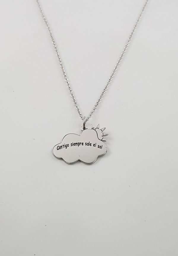 Colgante nube pequeña con la frase contigo siempre sale el sol, bañada en rodio,medidas 22 milímetros de alto y 17 milímetros de ancho, debajo del texto se puede grabar nombre o en la parte trasera