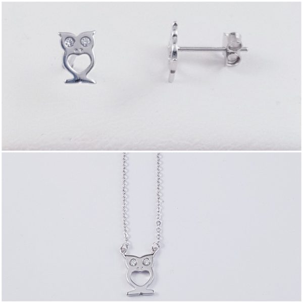 Conjunto plata de pendientes y colgante búho, bañado en rodio, largo 42 centímetros mas 2,5 centímetros en extensible.