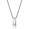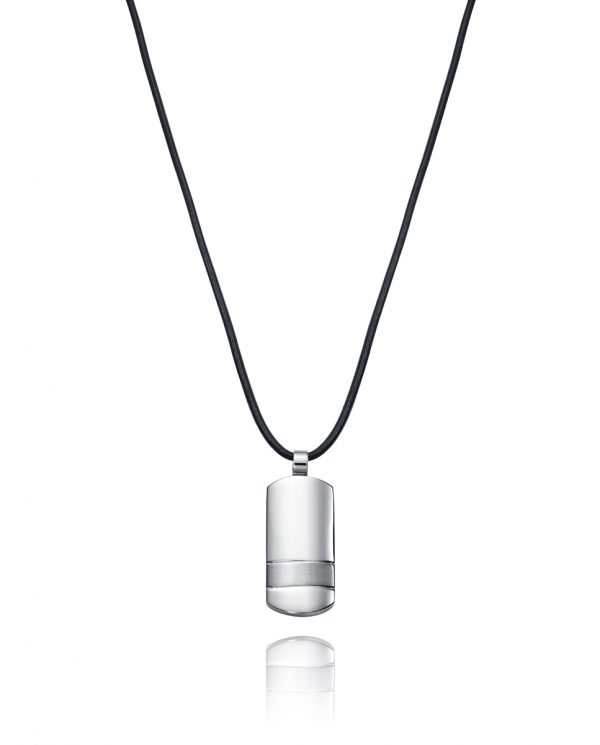 Colgante de hombre Viceroy de piel con placa de acero ovalada de 30×14 milímetros. Lleva un detalle de 2 líneas inferiores y satinado entre ellas. La cadena es de cuero negra de 48cm y con 3cm de extensible.