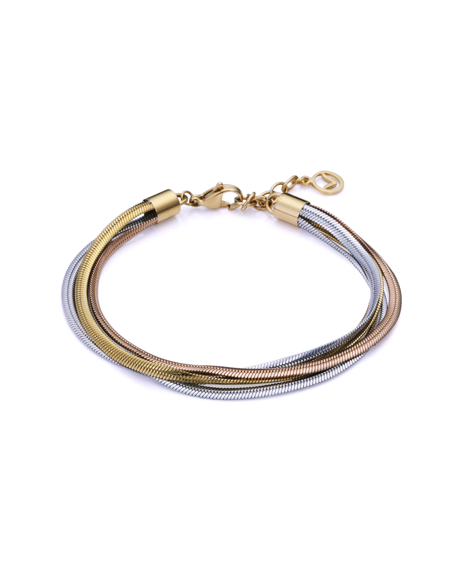 Pulsera múltiple de mujer en acero con diseño de cadena serpiente, que combina tres elegantes tonos: acero, IP dorado e IP rosa. Este diseño sofisticado y moderno ofrece un toque de distinción, ideal para complementar cualquier look. La mezcla de tonos metálicos añade versatilidad, haciéndola perfecta tanto para el día a día como para ocasiones especiales. Esta pulsera es ideal para la mujer que busca un accesorio con carácter y estilo, siendo una pieza imprescindible en su colección de joyas. Largo 17,5 + 2 cm