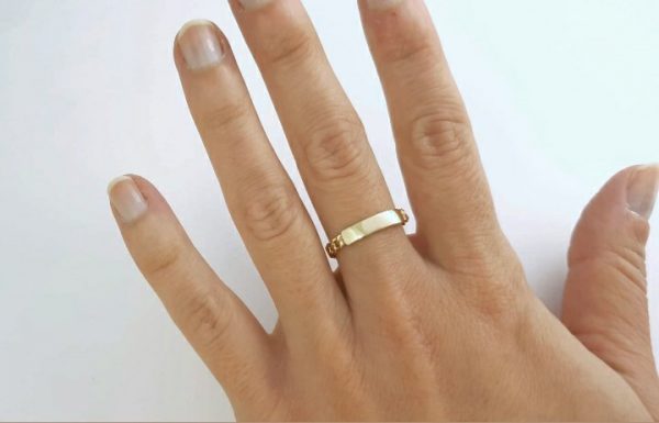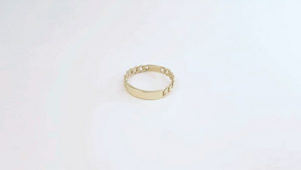Anillo de Oro Amarillo de 9 kilates de cadenita y una placa central. Tiene un estilo elegante y diferente, quedará estupendo en tu dedo. Mide 3,60 milímetros de ancho.