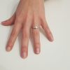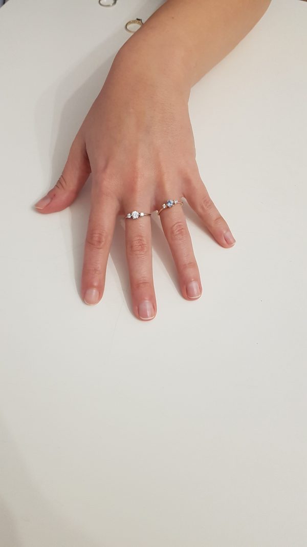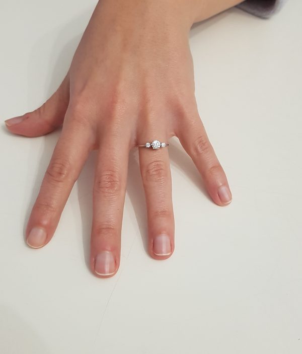 Anillo de Oro blanco 9 kilates con una circonita central de 5 milímetros y a su lado dos circonitas más pequeñas realzan su encanto. Está engastado en garras por lo que la luz permite que brille más aún.