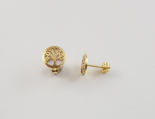 Pendientes árbol vida con nácar, oro amarillo 18 kilates, cierre presión, tamaño 8 milímetros.