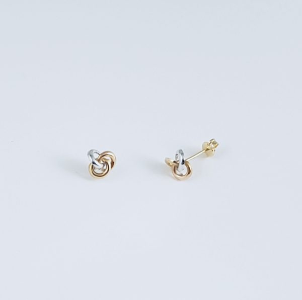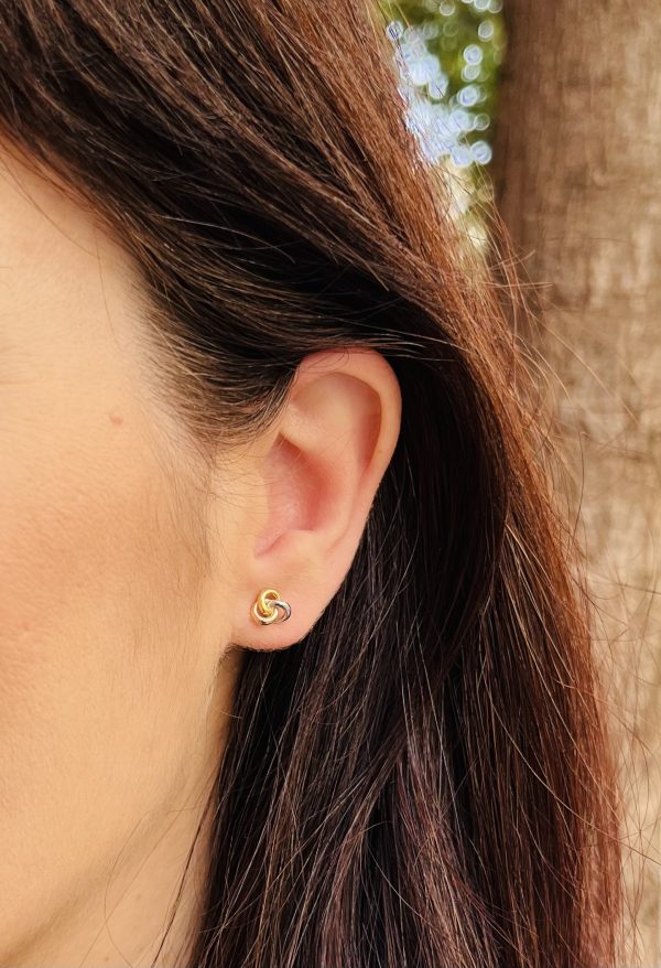 Pendientes de Oro 18 quilates con forma singular de nudo en tres colores. Su forma le da un aspecto muy original que no pasará desapercibido. Miden 7 milímetros de ancho y llevan cierre de presión.