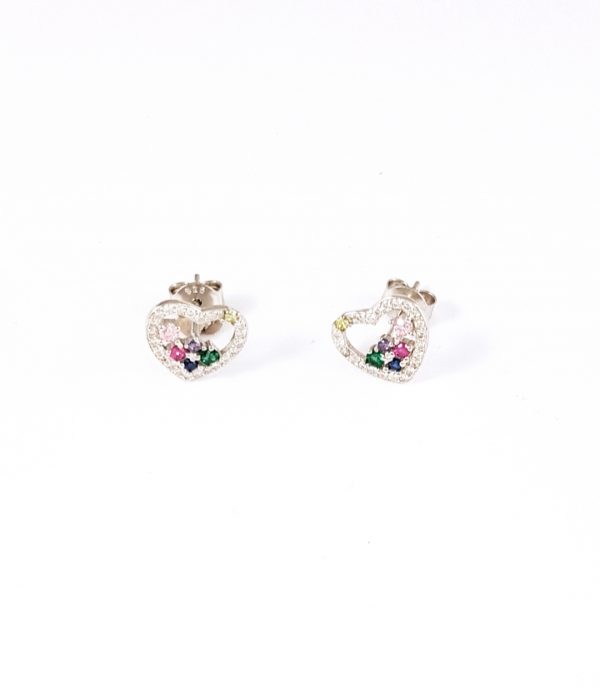 Pendientes corazón plata con zirconitas y piedras de color, bañado en rodio,cierre presión.