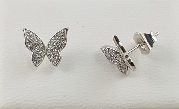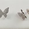 Pendientes Mariposa plata con zirconitas, bañado en rodio, cierre presión, tamaño 9,58 milímetros de altura, ancho 11,38 milímetros.