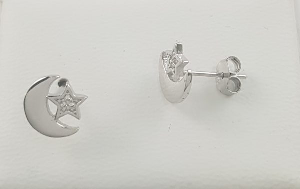 Pendientes plata luna con estrella con zirconita, bañado en rodio, cierre presión.