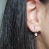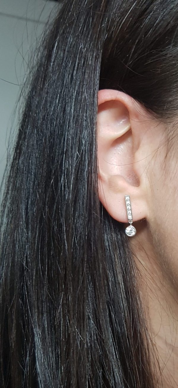 Pendientes de plata con circonitas. Tamaño 18 milímetros de alto, pendiente con movimiento, contiene 8 piedras de 1,25 milímetros y 2 de 4 milímetros. Lleva cierre de presión. Bañado en rodio