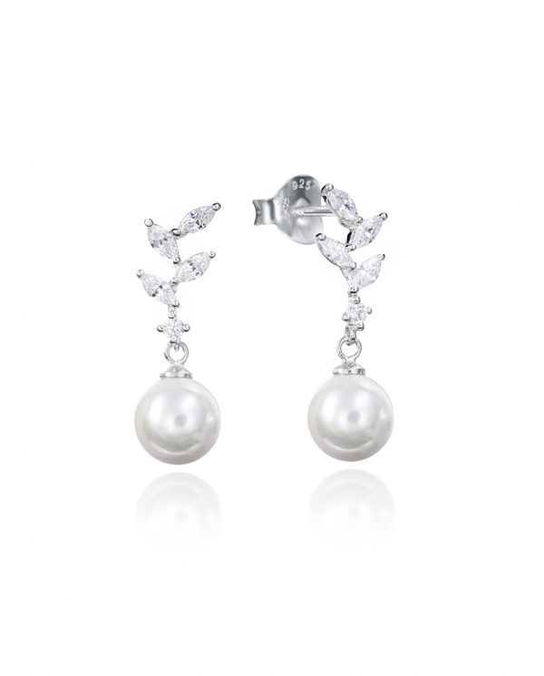 Pendientes de plata de primera ley con forma de hojas con circonitas y una perla que cuelga. Miden 23 milímetros de largo y llevan cierre de presión.