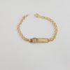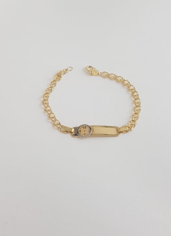 Pulsera para bebé con un reloj y placa para poder grabar el nombre. Oro amarillo y blanco 18 quilates. Tamaño: 14 milímetros de largo.