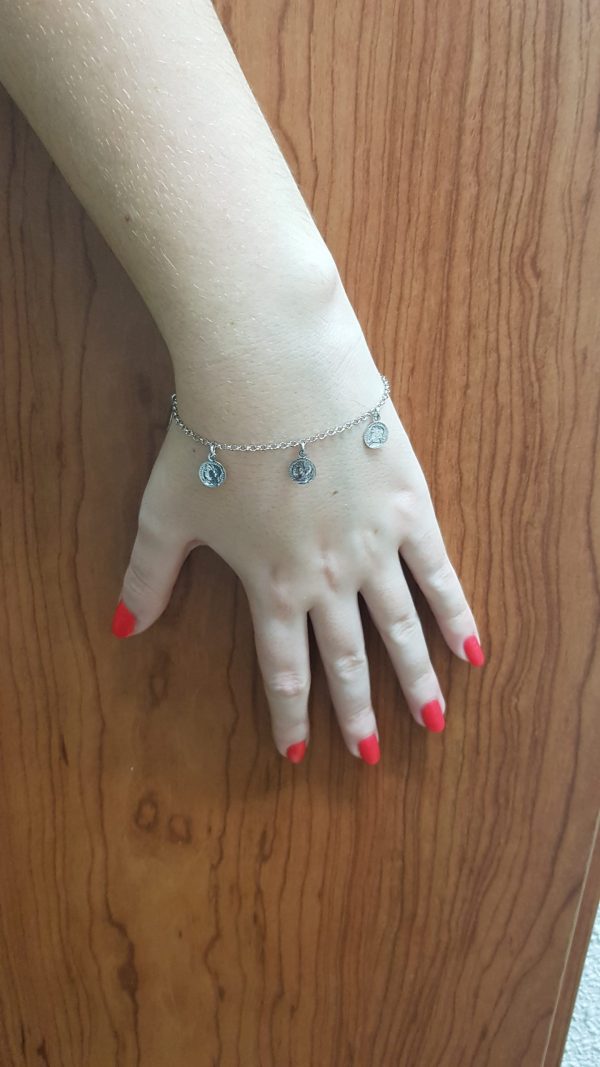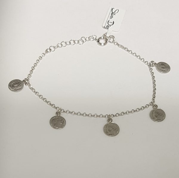 Pulsera de plata con monedas. Tamaño de las monedas: 8,12 milímetros. Medida de la pulsera: 16,5 centímetros más 3,1 centímetros del alargador.