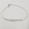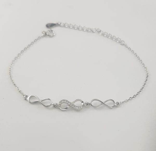 Pulsera plata con 3 infinitos, infinito central con zirconitas, bañada en rodio, medida 15,5 centímetros mas 2,5 en extensible