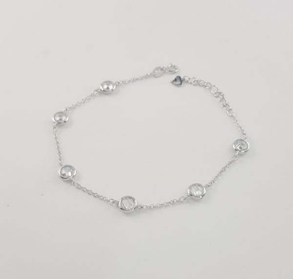 Pulsera plata con piedra facetadas blancas, bañada en rodio, medida 17 centímetros mas 2,5 en extensible.