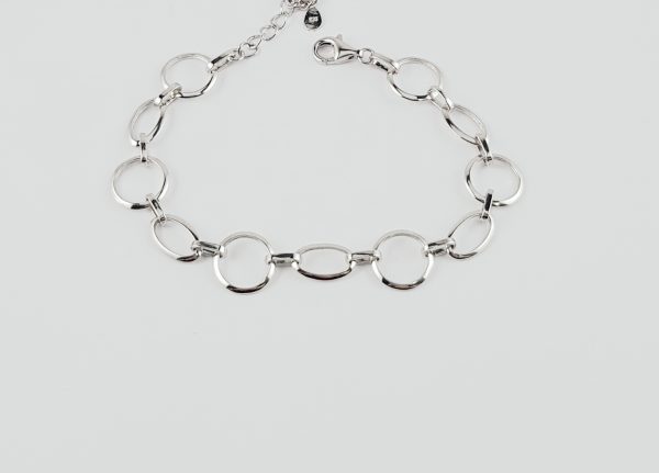 Pulsera plata forma oval y redonda, bañada en rodio, medida 17 centímetros mas 3 centímetros en extensible