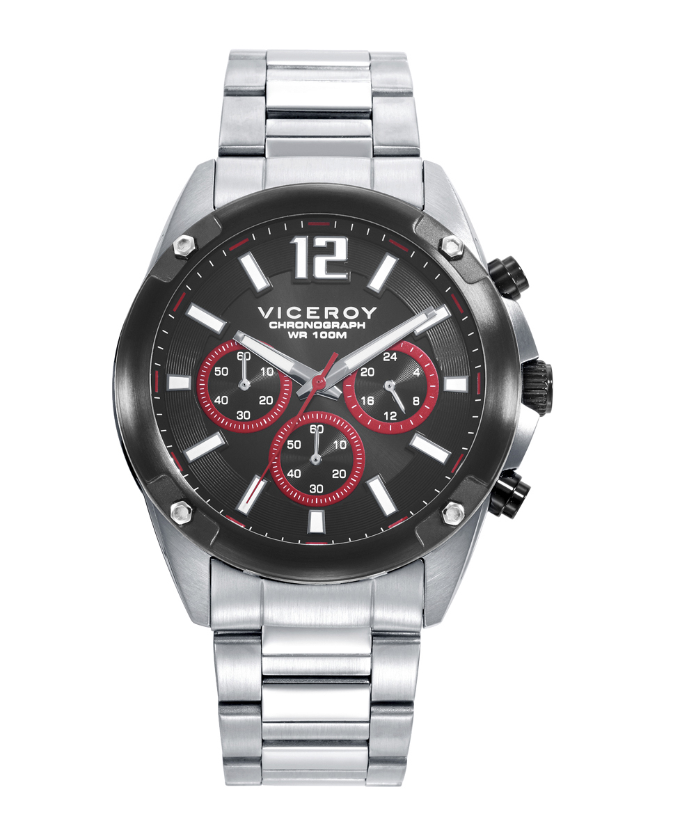 RELOJES, RELOJES VICEROYEste reloj de hombre cronógrafo combina un diseño audaz con detalles funcionales. La caja de acero con bisel IP negro y tornillos decorativos aporta un estilo robusto y moderno. El brazalete de acero refuerza su durabilidad, complementando la esfera negra que destaca por sus índices y contadores en color negro con un llamativo marco rojo. Las agujas horarias y contadoras en color plata, junto con el segundero en rojo, añaden un contraste dinámico y deportivo.