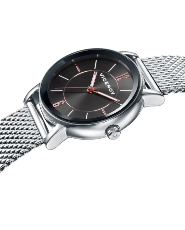 Reloj de Mujer Viceroy Air tres agujas con caja de acero, esfera y bisel negros, índices en blanco y rosa y malla milanesa