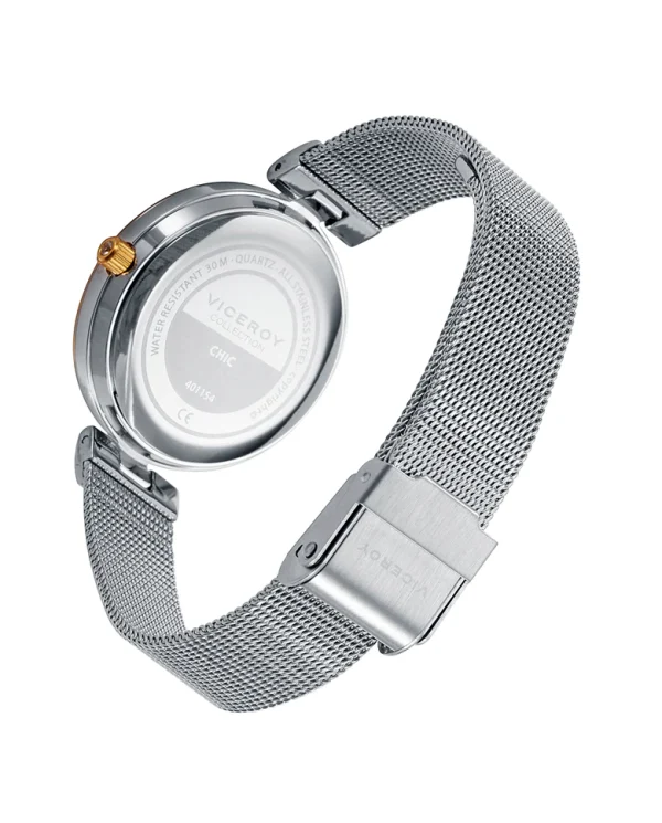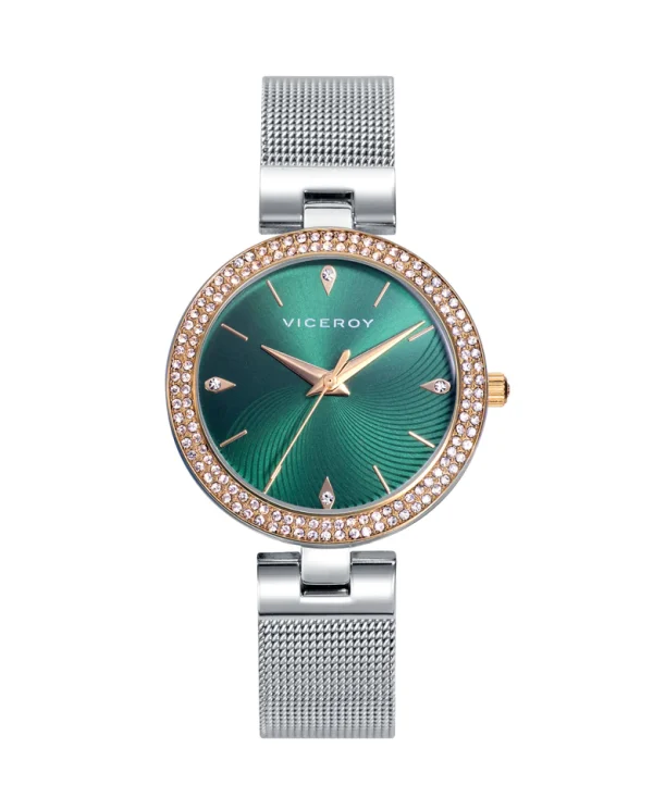 Reloj de mujer Viceroy Chic tres agujas, caja de acero con bisel Ip dorado con circonitas y malla milanesa, esfera de color verde.